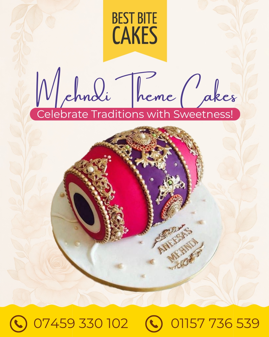 Add a touch of culture, color, and charm to your celebrations with our Mehndi Theme Cakes from Best Bite Bakers. Each cake is beautifully designed with intricate mehndi-inspired patterns, vibrant colors, and elegant detailing — perfect for pre-wedding events, engagement parties, and festive gatherings!